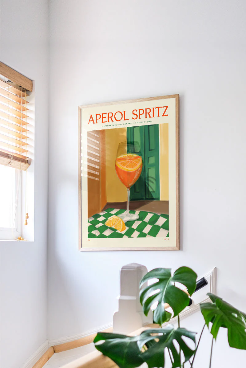Vibrant poster showcasing a refreshing Aperol Spritz, beautifully illustrated with ingredients. Its bright colors and cheerful vibe make it a delightful addition to any kitchen or bar!