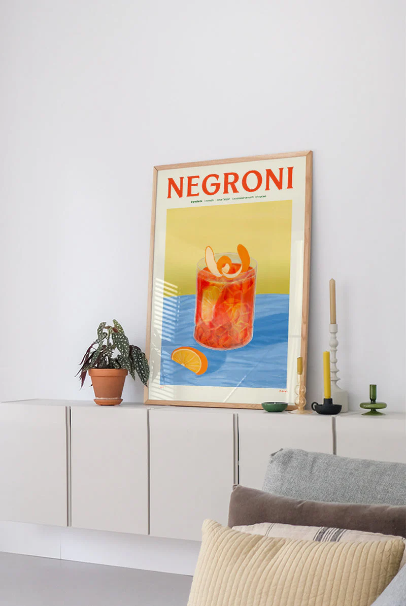 Colorful print showcases a delicious Negroni, beautifully illustrated with fresh ingredients. Its bold colors and inviting design make it a perfect addition for your kitchen!