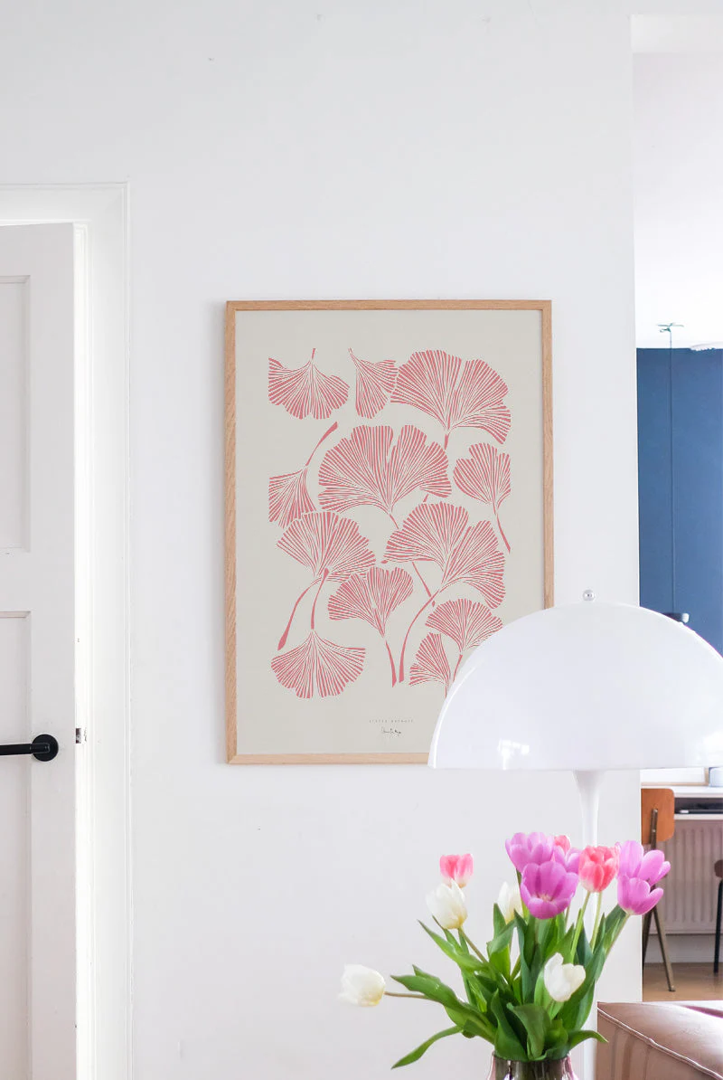 Featured here is a pink paper cut design of ginkgo leaves, intricately arranged against a light background, highlighting their unique shapes and delicate lines.