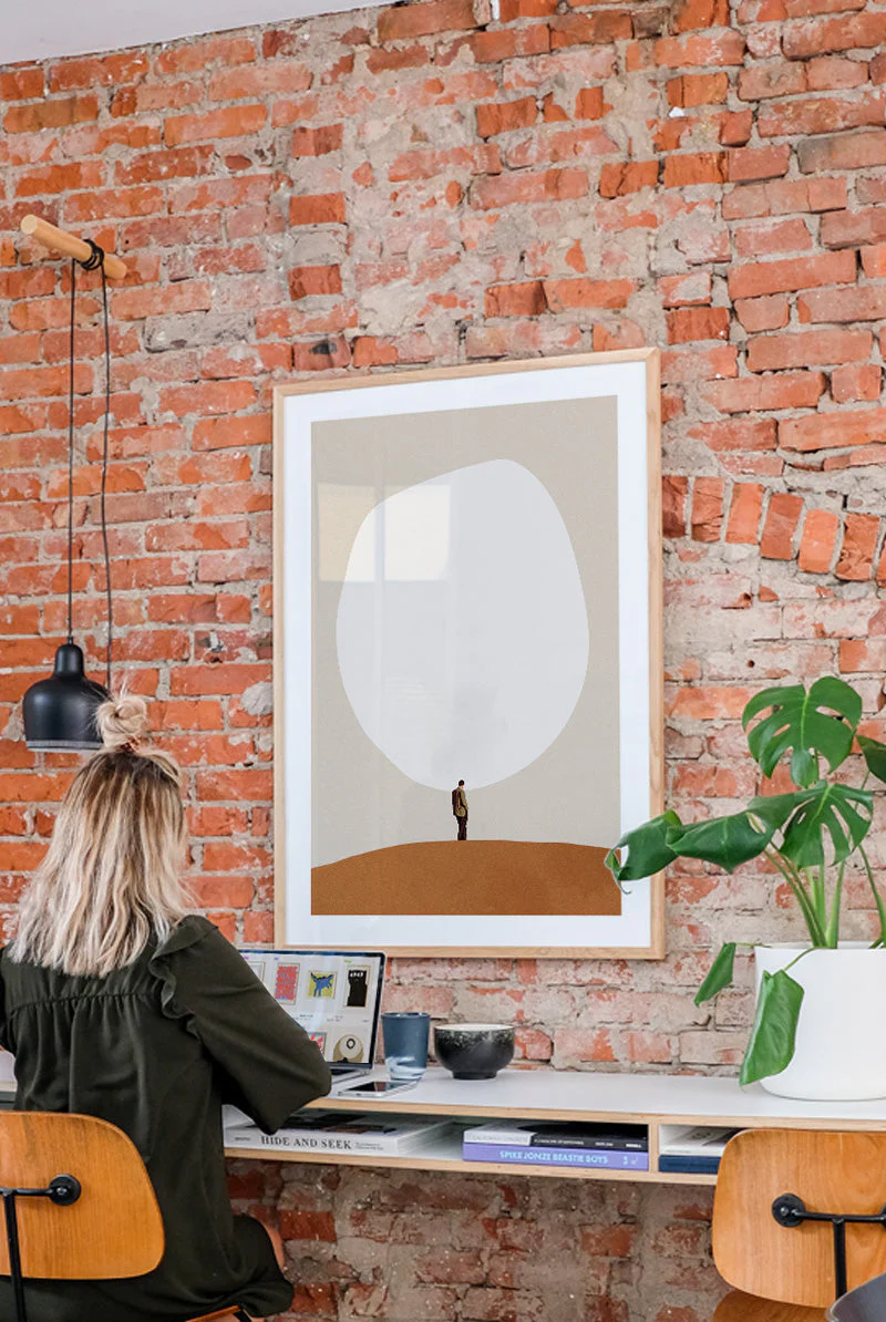 A minimalistic thought-provoking art print depicts a lone man standing on a sand dune, gazing at an oversized, white element.