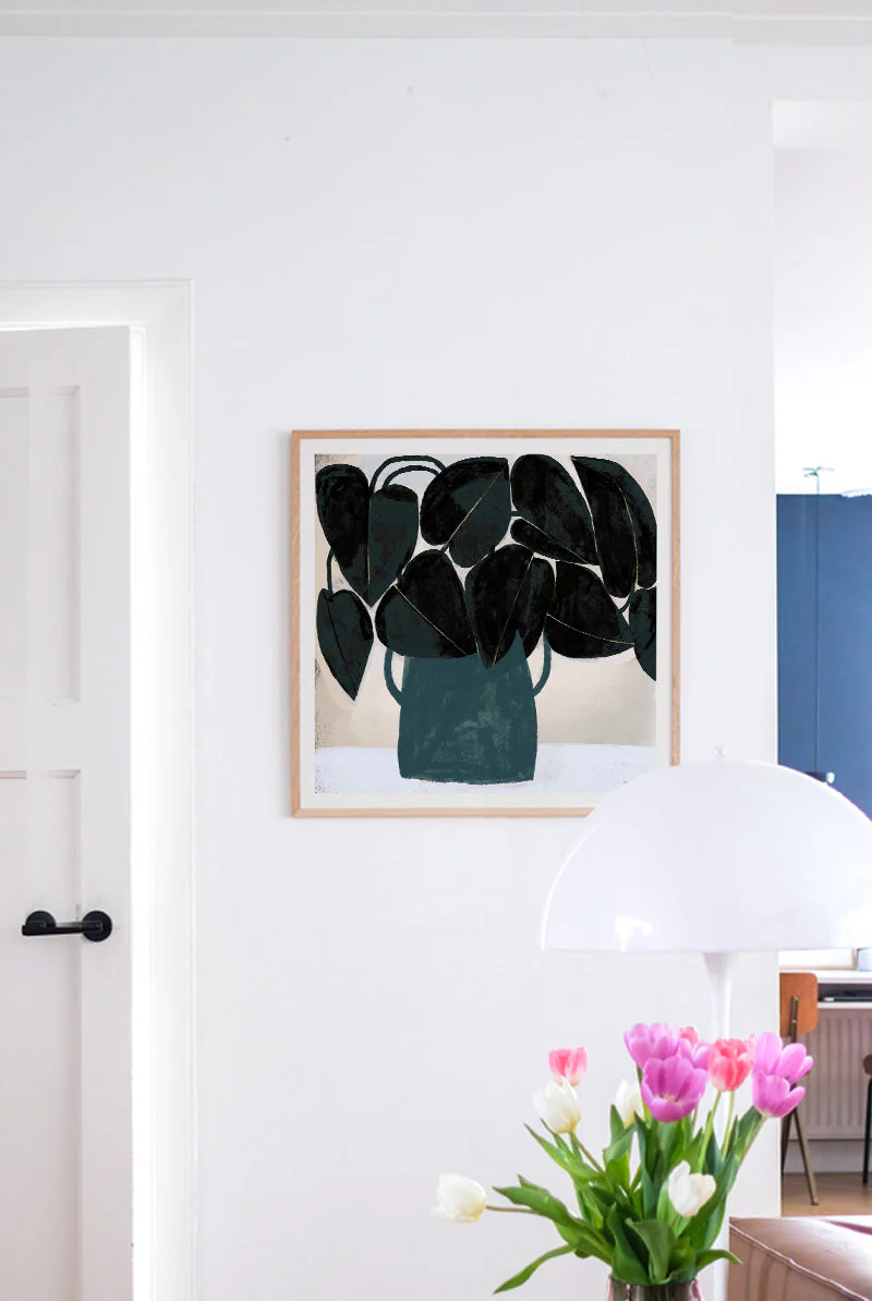 A contemporary artwork of lush, dark leaves in a blue vase against a soft background that gives a modern touch to any space!