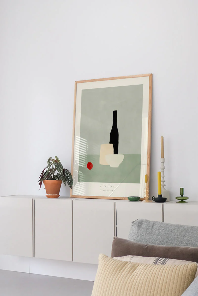 A still life artwork featuring a black wine bottle, a light-colored jar and bowl, accompanied by a red sphere against a muted background.