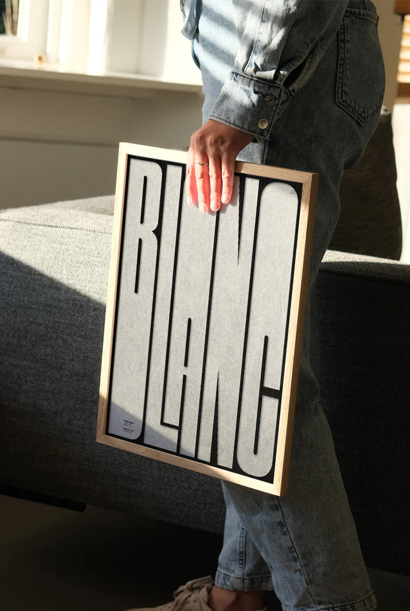 Striking art print boldly displaying the word "BLANC" in large white letters, creating a powerful statement piece that adds a touch of sophistication to your space!