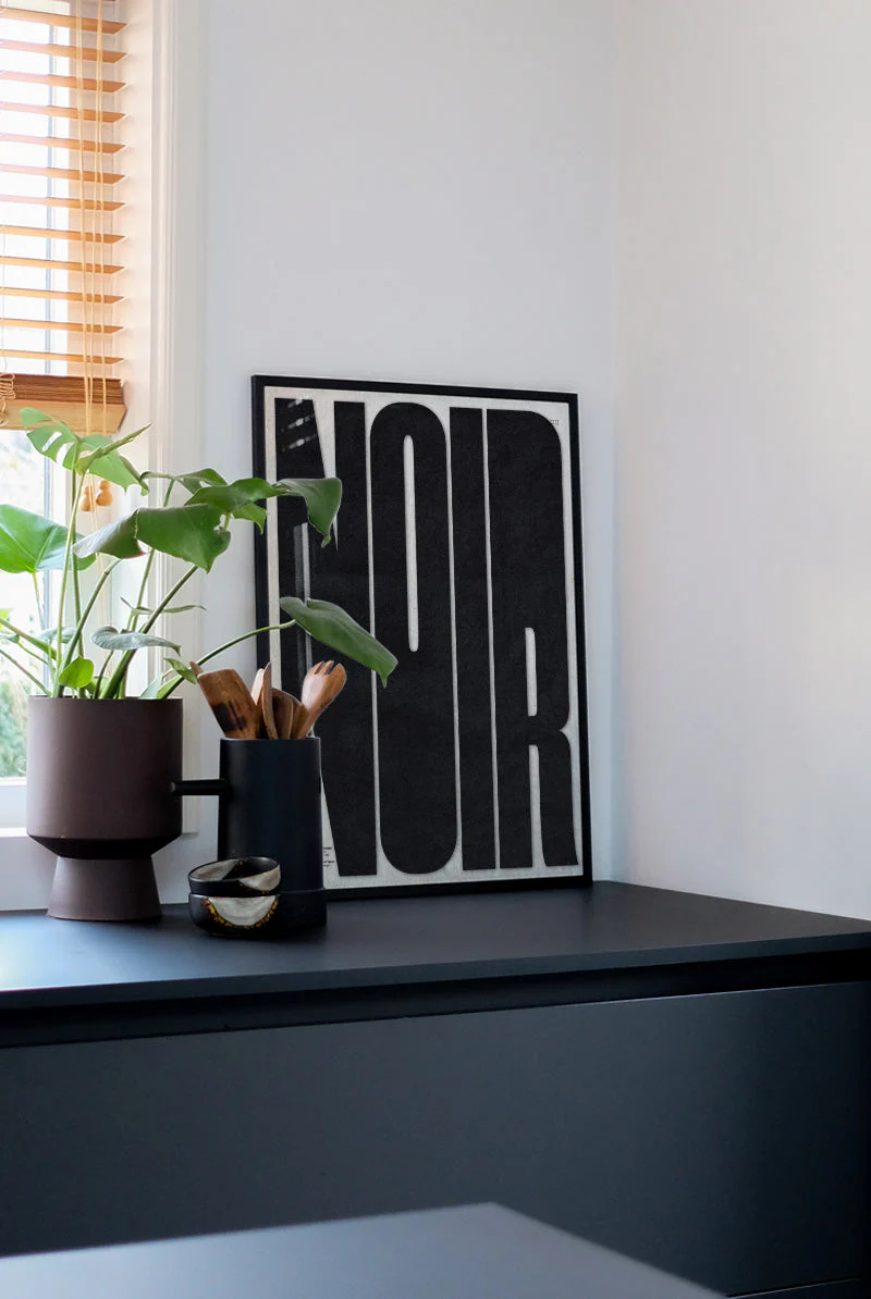 Striking art print boldly displaying the word "NOIR" in large black letters, creating a powerful statement piece that adds a touch of sophistication to your space!